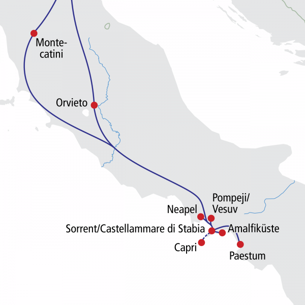 In Sorrent säumen üppige Zitronen- und Orangengärten und schöne Villen die gepflegte Uferpromenade, der bereits in der Antike beliebten Sommerfrische. Im Rahmen einer Stadtrundfahrt/-gang besuchen Sie im Anschluss Neapel, die turbulente Stadt am Fuße des Vesuvs. Sie werden überrascht sein über diese einzigartig gelegene Stadt, deren Altstadt zum UNESCO Welterbe zählt und in der es einiges zu entdecken gibt.